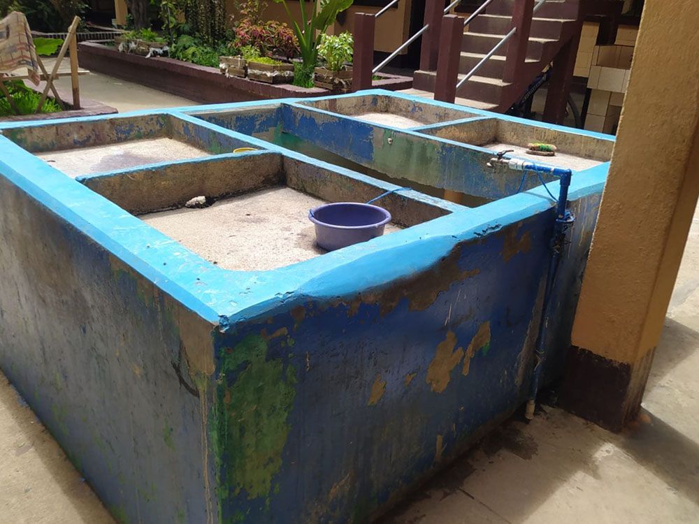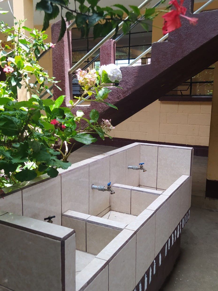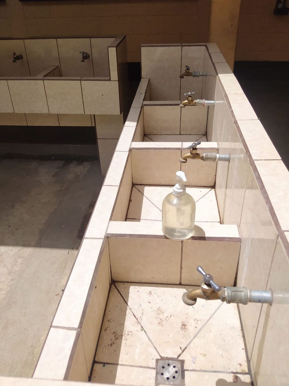 De lavabo's, die het Ministerie van Volksgezondheid geëist had, zijn inmiddels afgewerkt. Een hele verbetering qua hygiëne en voor de kleinste kinderen gemakkelijker in gebruik. De 'pila' was voor hen veel te hoog!